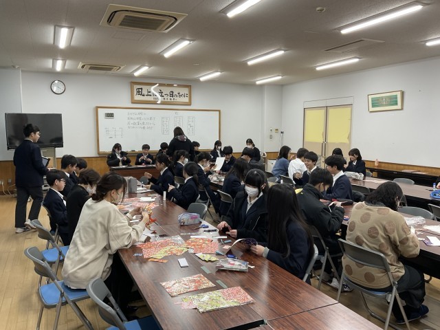 6年生から9年生の文化委員と地域の方が一緒に和紙を使ったブックマークを作成しました。