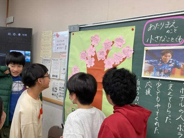 授業の最後には、横割りのグループのメンバーへの感謝の気持ちを桜の花の形のカードに書き表しました。