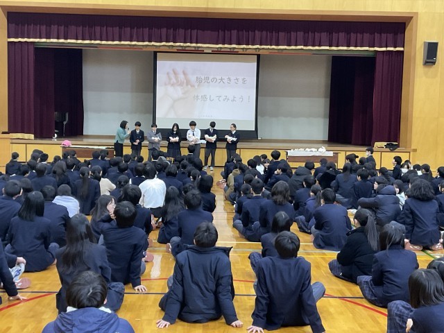 前半部分『いのちの誕生』をテーマにしたお話では、いのちの誕生までに私たちの体の中でどのような準備がされているか、そして、いのちが生まれてくるまさにその瞬間を映像を交えて説明してくださり、子ども達も真剣な眼差しで見入っていました。また、ご講演だけでなく、赤ちゃんは羊水の中でどのような音が聞こえているのか体験させていただいたり、胎児の大きさを体感するために様々な週数の胎児人形を抱っこさせていただきました。生徒からは、「想像してたより重い!」「こんなに大きな赤ちゃんがおなかの中にいるんだ」「ずっと抱っこしていたい」などの声が聞かれました。