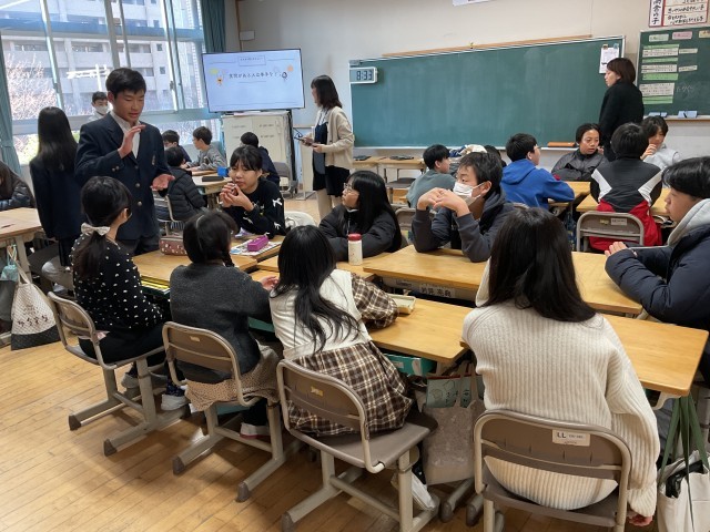 今回は、高倉小学校と御所東小学校の6年生と京都御池中学校の7年生が交流する時間です。