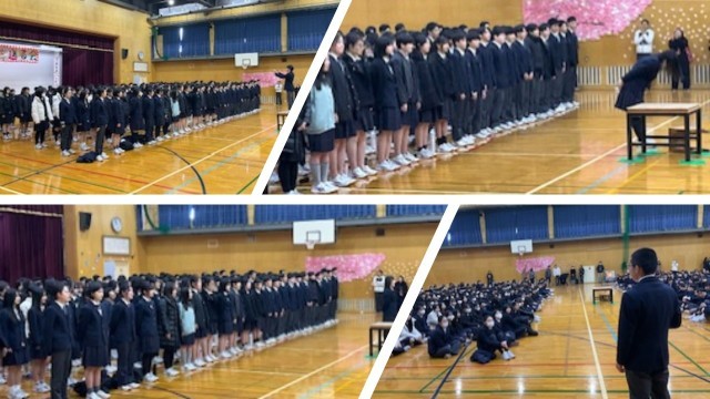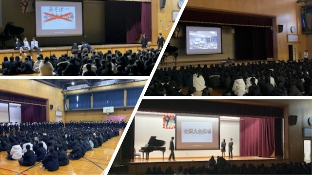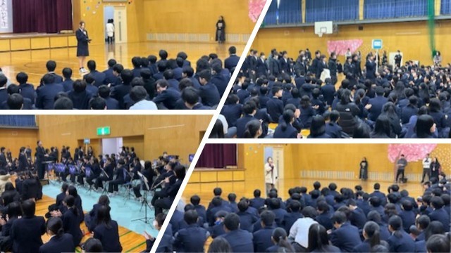 まず、今日のために委員会生徒がアリーナの飾り付けや校内の掲示などをしてくれた紹介がありました。お陰様で今日は朝から各学年が参加する卒業式が行われるような雰囲気になっていました。