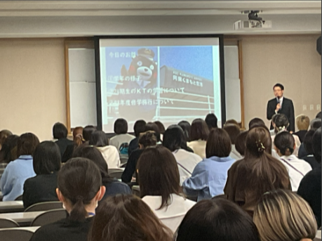 学年主任から、4月初めの生徒の様子や7年生から取り組んでいる「KT(総合的な学習の時間)」の内容、そして修学旅行について行程や服装・持ち物の説明をさせていただきました。
