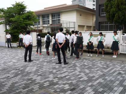 毎月4と9のつく日は「よんきゅうあいさつ運動」です。普段はよんきゅうの13小中学校で,タイミングを合わせて朝のあいさつ運動に取り組みますが,本日は休日参観のため中京中学校のみで行いました。代表の生徒たちは「よんきゅう絆プロジェクト」のたすきをかけてあいさつをしました。