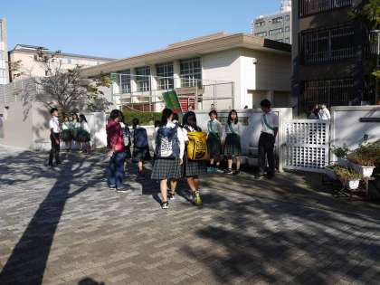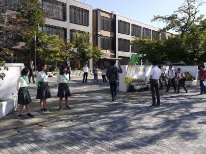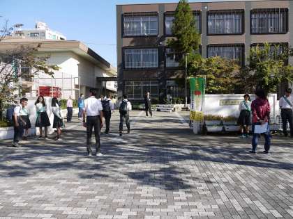 毎月4と9のつく日は「よんきゅうあいさつ運動」です。よんきゅうの13小中学校で,タイミングを合わせて朝のあいさつ運動に取り組みます。代表の生徒たちは「よんきゅう絆プロジェクト」のたすきをかけてあいさつをしました。