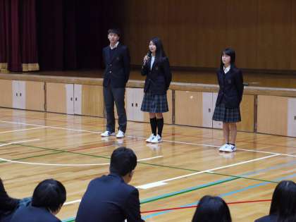 本日1限,体育館において3学期の始業式を行いました。校長先生からは「志を持って,後悔のない1年にしましょう」というお話がありました。また生徒会からは,12月に行われた生徒会交流会と,CAN活動の報告がありました。