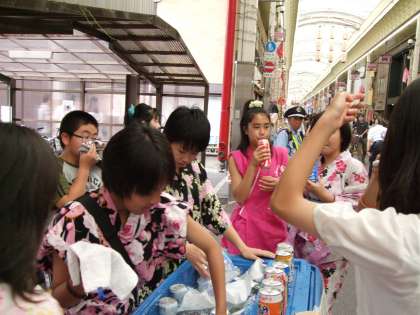 7月2日(土)三条会の七夕です。毎年、祇園祭の宵山かと思うほどの人出です。なかなか前へ進めません。生徒はもちろん、地域の人達も楽しみにしています。何軒くらいの店が出ているのでしょう、数えきれません。毎年生徒会とPTAも出店します。生徒会はソフトドリンク販売、PTAは今年はゲームコーナーを作りました。両方とも盛況で生徒会は早々に完売でした。今日の収益はすべて生徒会費用に充てられます。生徒会は本校の「CAN活動」の一環として行っています。(空き缶の回収取り組み)販売する人、プラカードを持ってアピールする人など、それぞれ分担をして、とてもよいチームワークでした。浴衣を着てくる人もいて、とても楽しい時間でした。暑いのにご苦労さまでした。