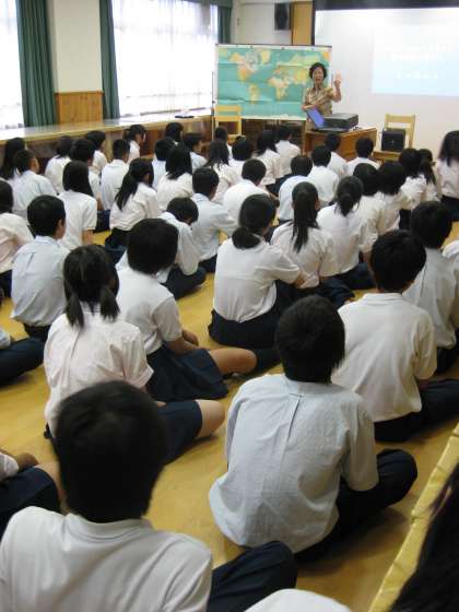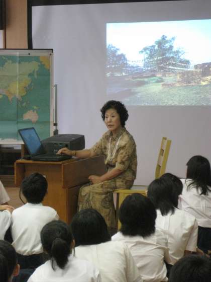 本日3・4限、2年生を対象とした人権学習がふれあいルームで行われました。講師としてお招きしたのが、本校の「CAN活動」で重要な役割をして頂いている、太田佐知子元校長先生です。生徒や地域の皆さんの善意を、ネパールの山奥へ直接持って行ってもらっています。約1時間30分、ネパールへ行くようになった理由から、現地の様子、写真による解説など、盛りだくさんでした。生徒達は、自分たちの取り組みの結果がどうなっているのかがよくわかったと思います。写真の解説ではヒマラヤの山々の美しい姿や、村の様子など詳しい説明がありました。