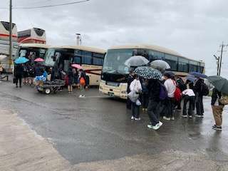 1日目の体験場所「三和農園」に到着しました。予定より少し早く,「三和農園」に到着しました。バス内で体験の服装に着替え,その後昼食を食べ,1日目の体験がスタートします。やはり,南信州 飯田市も雨だそうです。