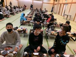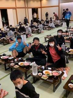 お風呂にも入り,お土産も買い,待ちに待った夕食の時間です。おいしそうな夕食です。たくさん食べて,レクリエーションを楽しみ,明日に向けて,早く寝ましょう。