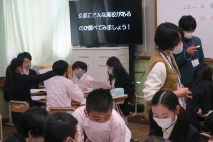 明日,私立高校と公立高校の先生をお招きして,進路講話を行います。それに向けて,1年生は学活で「京都にある高校を探そう」を行いました。タブレットなどを駆使して場所の確認をしていました。2年後には進路を決めることになります。それに向けて,少しずつ学習していってください。