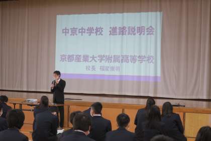 本日3,4限,中京中では1・2年生対象の進路講話を実施しました。京都産業大学附属高校と京都府立朱雀高校から講師の先生方をお招きし,私立高校と公立高校について説明していただきました。例年は1,2年生合同で行っていましたが,今年度は各学年ごとに2回お話しをしていただきました。今日のお話を,今後の進路選択に生かしていってほしいと思います。