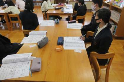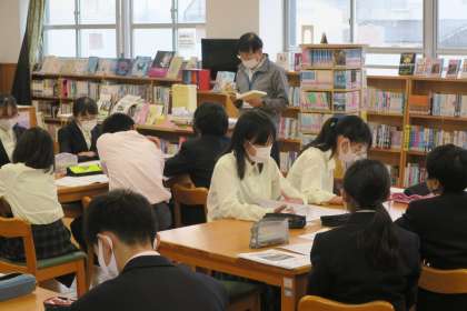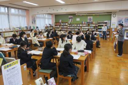 1年生の国語の時間に,図書室でのオリエンテーションを行いました。学校司書の先生から,図書室の利用の仕方,貸出の方法,本の探し方,調べ学習の仕方等の説明がありました。学校司書の先生が本を探しやすいように整理整頓をしていただいたり,生徒の興味のある本を購入してくれています。授業や昼休みなどたくさん図書室を利用してほしいと思います。