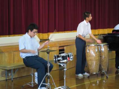 いよいよ当日です。保護者の方が早くからお見えになっています。やはりお母さんが多いようですが、お父さんやお年寄りも来てくださっています。今日の気温は34度。まるで真夏のようですが、暑さに負けず。熱演しています。体育館には扇風機を数台入れたのですが、効き目があったかどうか?熱中症には気を付けました。