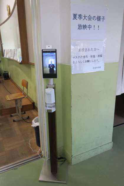 (2)校舎内にサーマルカメラと消毒用アルコールを設置しますので,教室に入られる際には,検温と手指の消毒をお願いします。