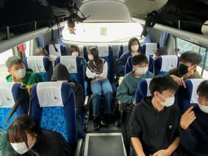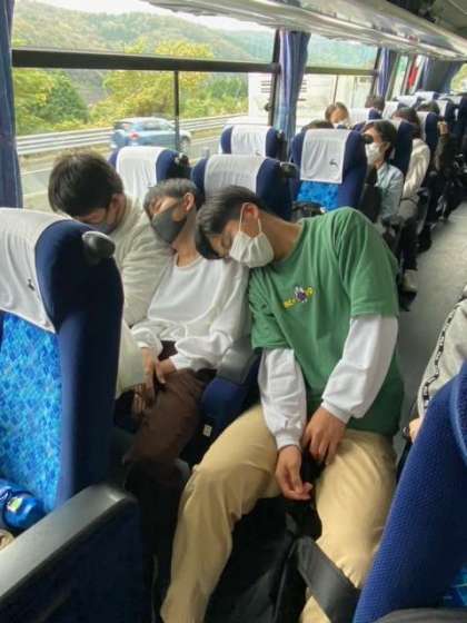 恵那峡SAを出発し,昼食場所の三和農園に向かっています。少し疲れて寝ている生徒もいるみたいですね。