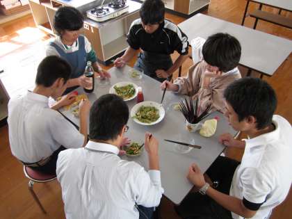 3限、調理室で1組が調理実習をしていました。担任の先生と学生ボランティアが2名手伝っていました。メインは「ゴーヤチャンプル」でした。みんなで作って試食をしていました。そして焼きたてのケーキが出来ました。ちょうどそこへお邪魔をしましたところ、ケーキを頂きました。とても美味しかったです。また呼んで下さい。