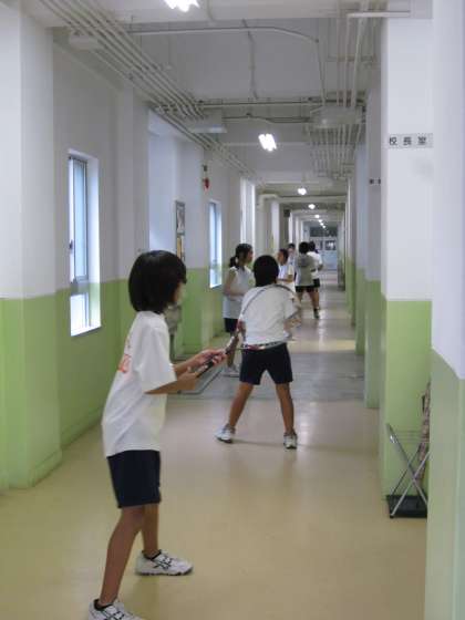 北校舎を使ってあちこちで部活動をしています。北校舎1階でテニス部、素振りをしています。(ラケットで叩かれそうになりました)