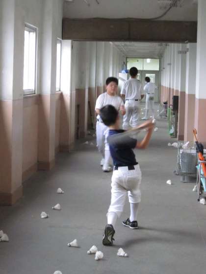2・3階では野球部がバッティングの練習、バドミントンの羽などを使っています。