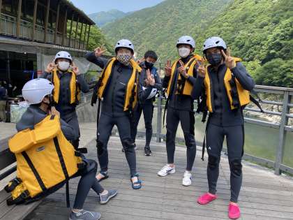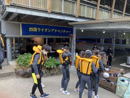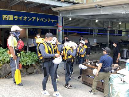 さあー,これからラフティングが始まります。ライフジャケットを着ています。