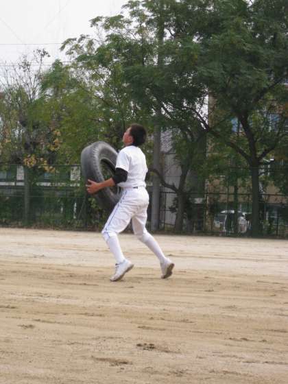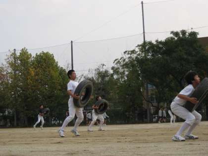 放課後の野球部の練習です。みんな頑張っていますね。体を鍛えてしっかり練習をして下さい。まずは体力です。このタイヤ結構重そうです。