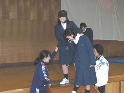 本日3・4限全学年で人権学習が行われました。1年生は「バリヤーフリー体験」と言うことで、アイマスクをして歩行をしました。体育館にコースを作って、それぞれペアごとに交代しながら歩く体験をしています。