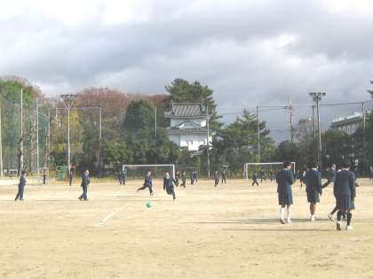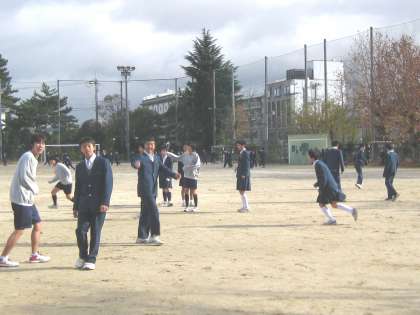 午後1時、気温も少しずつ上がって、よい天気になりました。グランドは生徒でいっぱいです。学級用のボールを出して遊んでいます。ボール1個あれば何時間でも遊べるのでしょうか?ほとんど毎日、夏も冬もこんな様子です。ストレスが溜まらなくていいと思いますね。