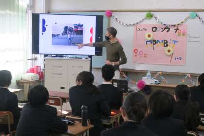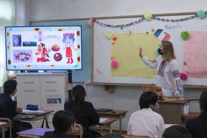 本日5、6限 2年生は京都市国際交流センターからフランスの方とウクライナの方2人を講師としてお招きし、外国の文化についてや様々な国の人たちと共に生きる社会について学びました。