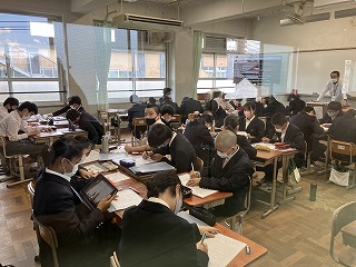 2年生の3階のフロアはいつも通りの頑張る雰囲気。いつもの風景でした。落ち着いた学習態度で勉強していました。数学の授業では、グループ学習で考察をまとめていました。GIGA端末を使ってまとめている生徒も複数おられます。身近なツールとしてみんなガンガン使っていますね。