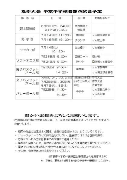 運動系部活動の公式戦日程(夏季大会)がまとまりました。