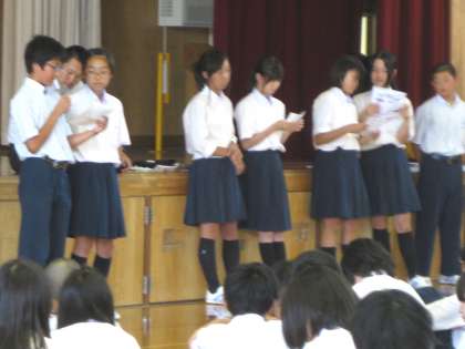学級の代表が前に出て発表をしています。4月から今日までの学級を振り返っているようです。