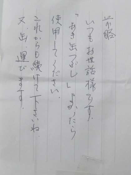 地域から持ってきて頂いた「空き缶」を回収していましたら、手紙とともに写真のような道具が置かれていました。