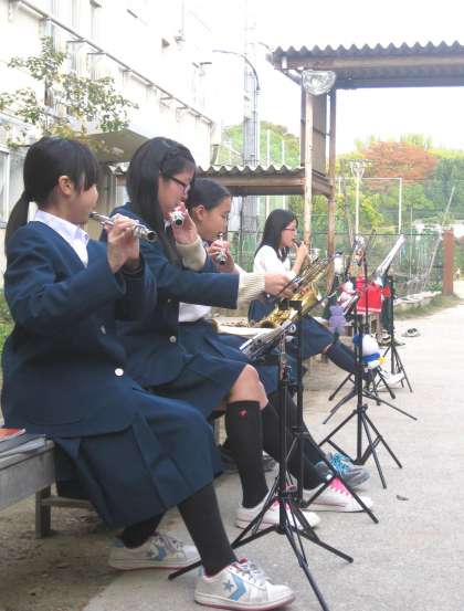 3年生は懇談中、中庭では吹奏楽部が練習しています。