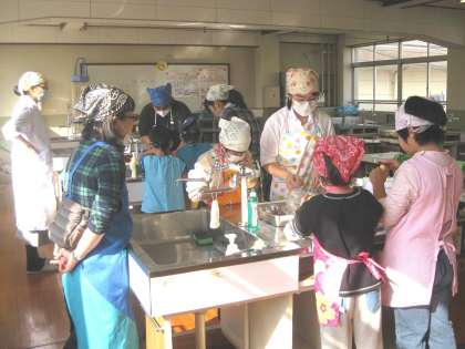 1組の教室で、全体で自己紹介をした後、調理実習をするために調理室へ入りました。