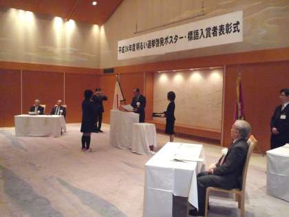 11月18日(日)、「平成24年度明るい選挙啓発ポスター・標語入賞者表彰式」が京都府公館レセプションホールで行われました。
