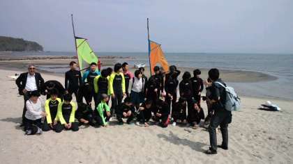 住吉浜でウインドサーフィンを前に記念撮影です。
