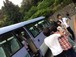 バスに乗ってさっそくおおはしゃぎのクラスの様子と、