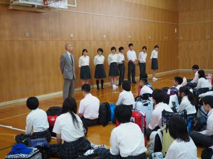 校長先生のお話、学年代表からのあいさつ、筒井先生からの諸注意、添乗員さんやカメラマンの方の紹介がありました。いよいよ出発です。