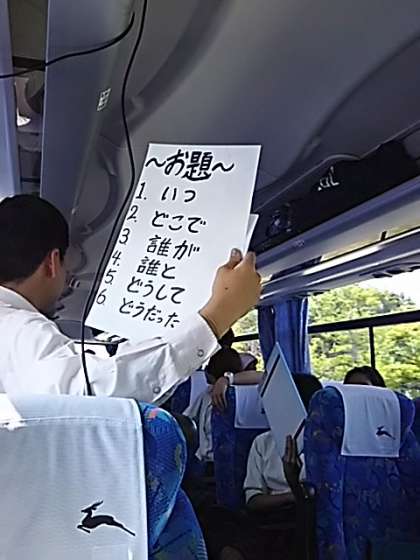 早朝からの集合にもかかわらず、みんな元気に、トランプをしたり、歌を歌ったり、楽しく過ごしています。文化委員によるバスレクが始まりました。 吉田先生より