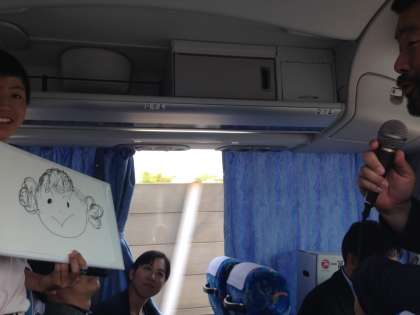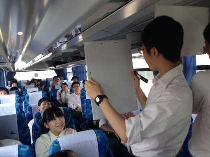長いバス移動が続きますので、生徒諸君はバスの中でできるレクレーションを考えてくれています。1号車では、who am I?というお絵描きゲームで、文化委員が進めてくれています。