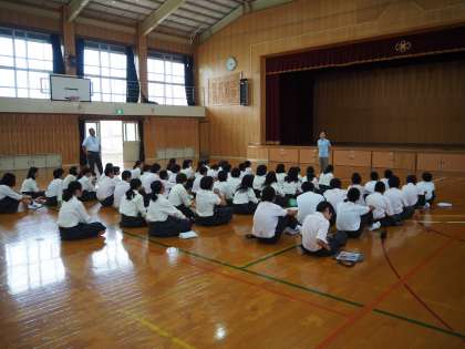 1年生は、学年集会で、夏休みの生活を振り返るとともに、学年の先生からのお話でこれからの学校生活に向けて頑張ることを、中京中学校で初めての体育大会や文化祭にしっかり取り組んでいこうとを確認しました。(写真上)