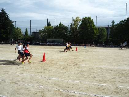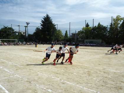 2年団体種目 台風の目です。4人一組で棒を持って回転したり、全員で飛び越えたりして、つないでいきます。