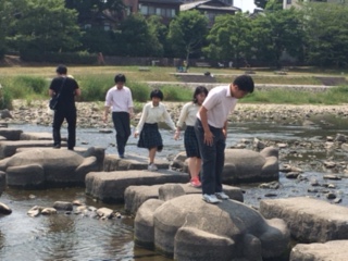 下鴨神社で、インタビューした後の様子です。あまりの暑さに、つい鴨川へ。亀さんの飛び石に、はしゃぎまくりです。
