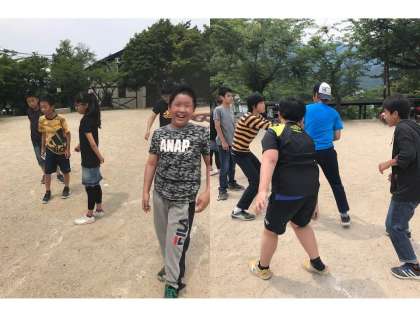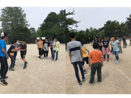 次のレクリエーションは「島渡り」です。クラス対抗で、決められた陣地から外に出ないように一周します。それぞれが勝負を楽しんでいました。