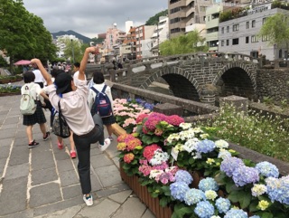修学旅行二日目、長崎市内班別研修です。眼鏡橋付近です。あじさいがきれいに咲いています。