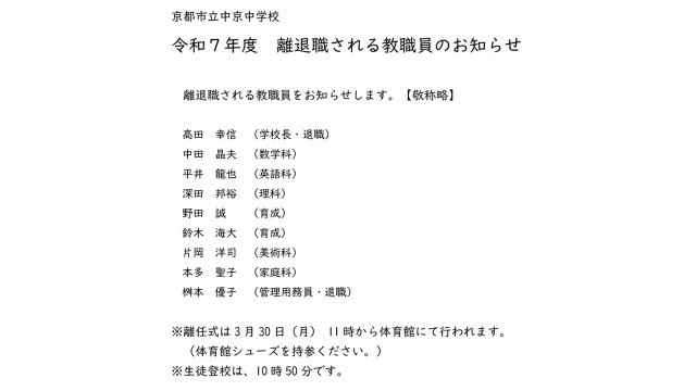 離任式が3月30日(月)11時から行われます。