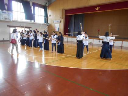 学校紹介の後は、体育館で剣道部の活動を参観し、実際に竹刀を持って素振りや打ち込みのしかたを部員に教えてもらいました。