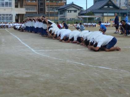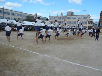 3年学年種目「組体操」の様子です。いくつもの「見せ場」に客席から拍手が起こりました。