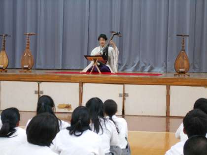 6日(金),6限に2年生は伝統文化に関する学習を行いました。琵琶保存の先生から歴史や特徴等の説明をうけた後,筑前琵琶の演奏を聞くとともに,代表生徒が琵琶演奏にチャレンジしました