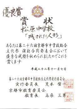 11月6日(土),7日(日)の二日間にわたり,京都市北文化会館で中学校総合文化祭の演劇合同発表会がおこなわれました。春の演劇合同発表会で優良賞をもらった,我が松原中学校の演劇部も出演しました。「残された人形」という題名で,ナチスドイツとユダヤ人の戦時中の話を題材にした劇です。出演者は,しっかり声を出して,はっきりと台詞が言えたと思います。大変素晴らしい劇でした。このたびも頑張ったことが評価され,優良賞を頂くことが出来ました。ご苦労様でした。