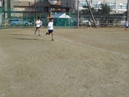 体育科の授業では,持久走を行っています。少しでもいいタイムが出せるよう,頑張って取り組んでいます。